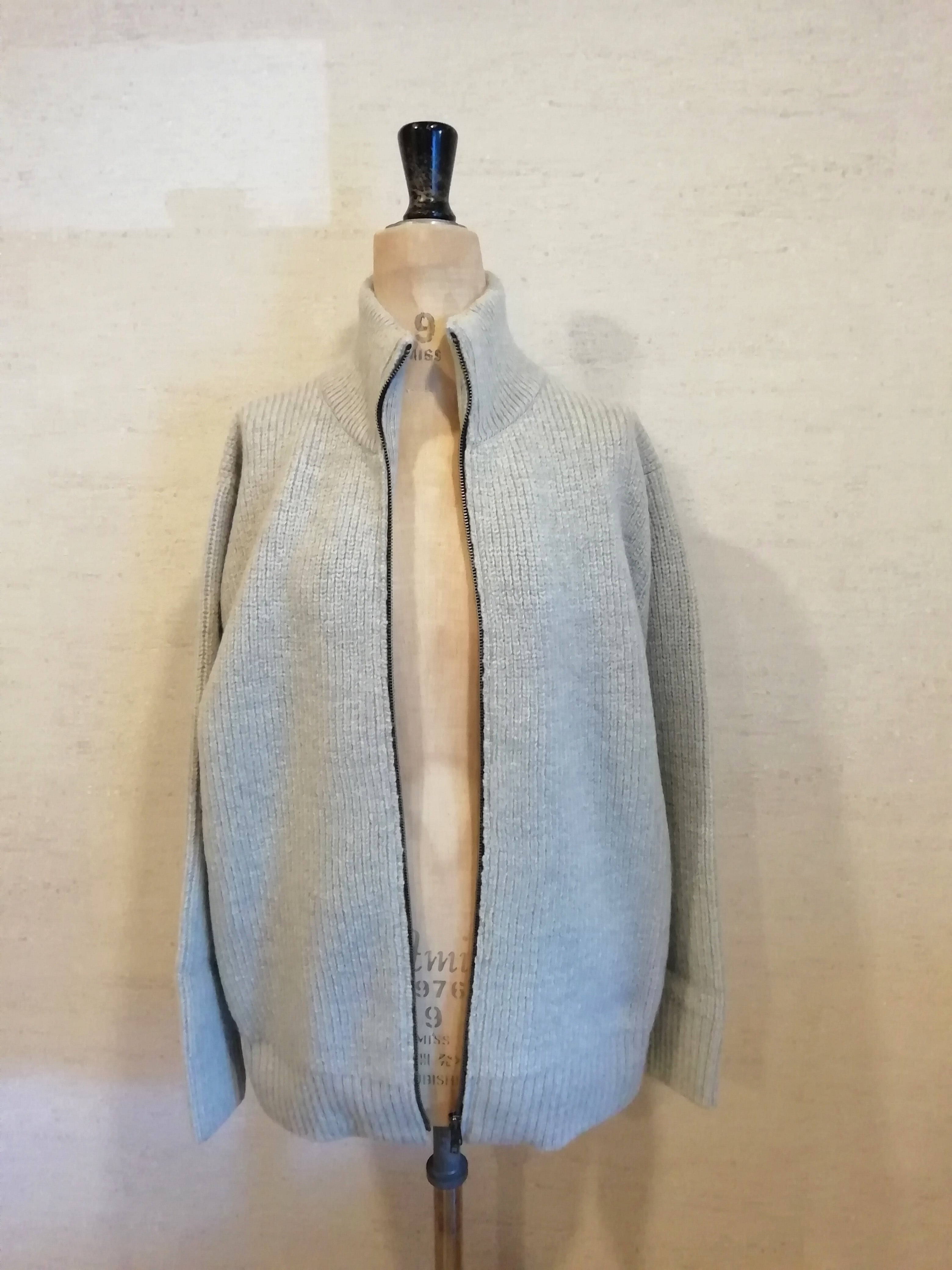 前中心に逆開ファスナー(上からも下からも開く)を使用、両脇にスラッシュポケットがついた、本格派のブルゾンです。防寒・防風に優れますが、ニットならではの上品な印象です。